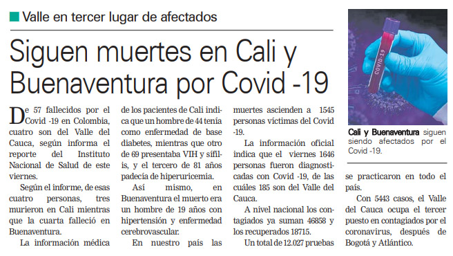 Siguen muertes en Cali y Buenaventura por Covid-19, diario occidente