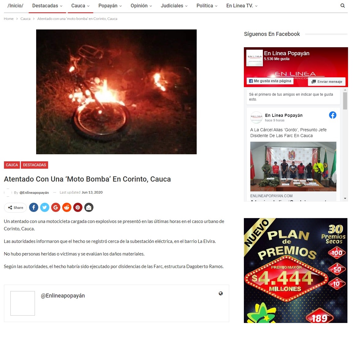 Un atentado con una motocicleta cargada con explosivos se presentó en las últimas horas en el casco urbano de Corinto, Cauca. Las autoridades informaron que el hecho se registró cerca de la subestación eléctrica, en el barrio La Elvira. No hubo personas heridas o víctimas y se evalúan los daños materiales.