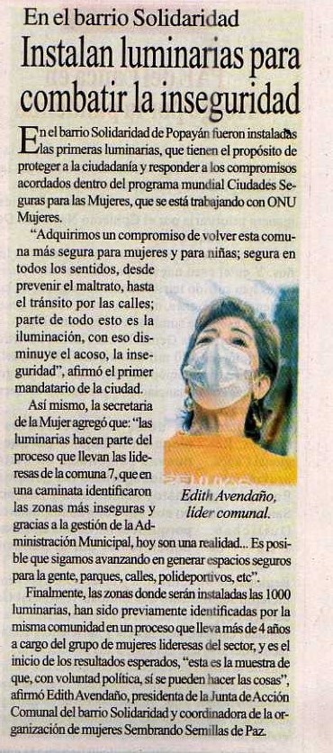En el barrio Solidaridad de Popayán fueron instaladas las primeras luminarias, que tienen el propósito de proteger a la ciudadanía y responder a los compromisos acordados dentro del programa mundial Ciudades Seguras para las Mujeres, que se está trabajando con ONU Mujeres
