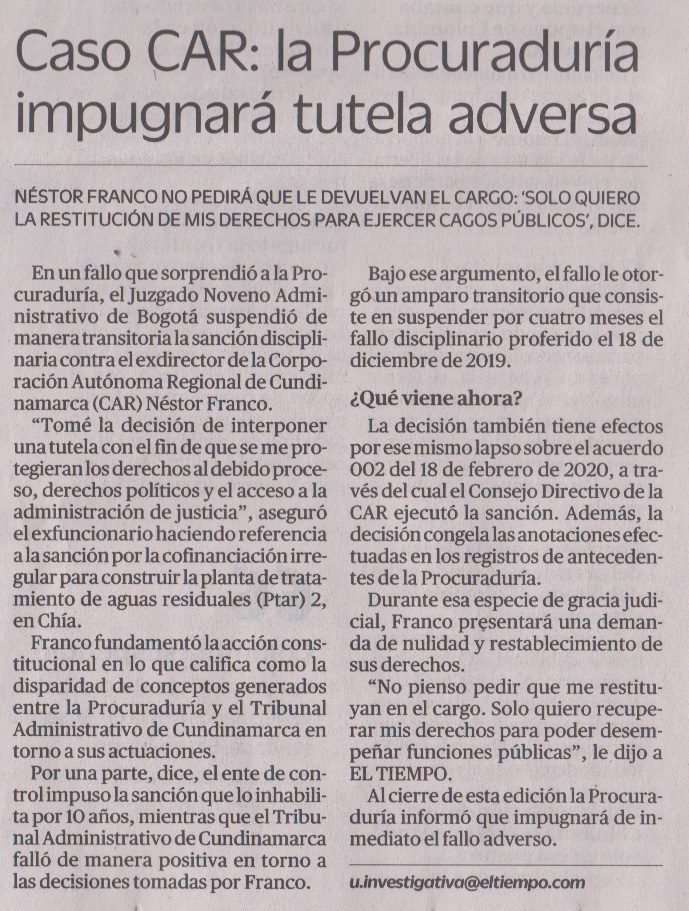 Caso CAR- La Procuraduría impugnará tutela adversa, pag 1-6, El Tiempo