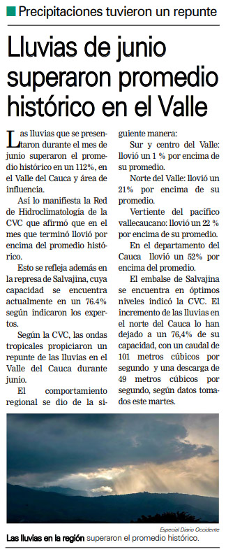 Lluvias de junio superaron promedio histórico en el Valle, pag 6, Diario Occidente