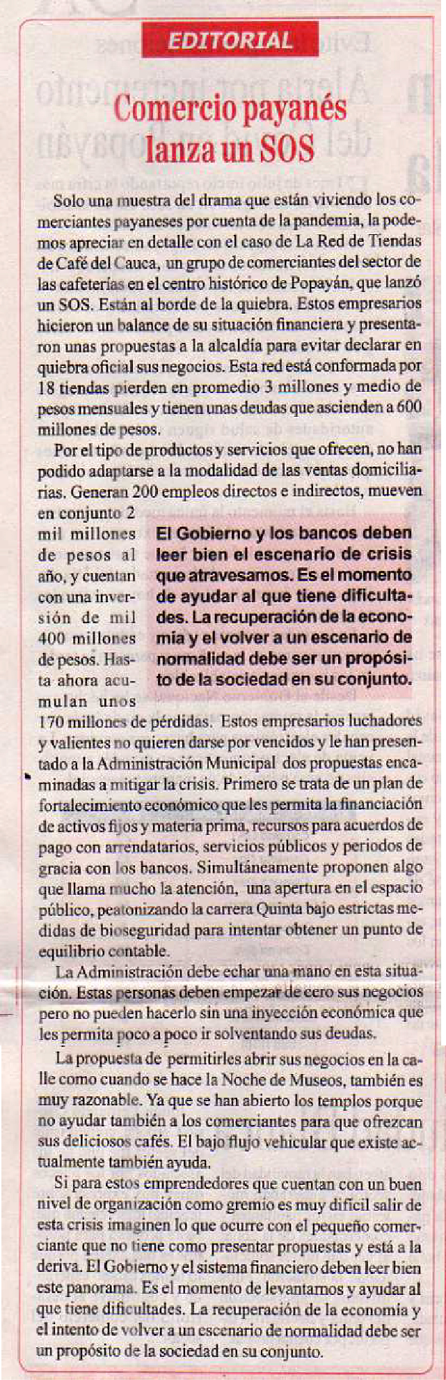 La Red de Tiendas de Café del Cauca, un grupo de comerciantes del sector de las cafeterías en el centro histórico de Popayán. que lanzó un SOS a la administración municipal que consiste en un plan de fortalecimiento económico que les permita la financiación de activos fijos y materia prima, recursos para acuerdos de pago con arrendatarios, servicios públicos y periodos de gracia con los bancos.