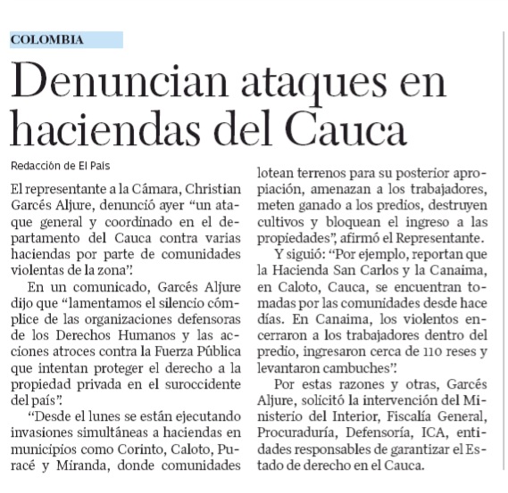 Christian Garcés, representante a la Cámara del Valle del Cauca por el partido Centro Democrático, denunció este miércoles ataques contra haciendas ubicadas en el departamento del Cauca.