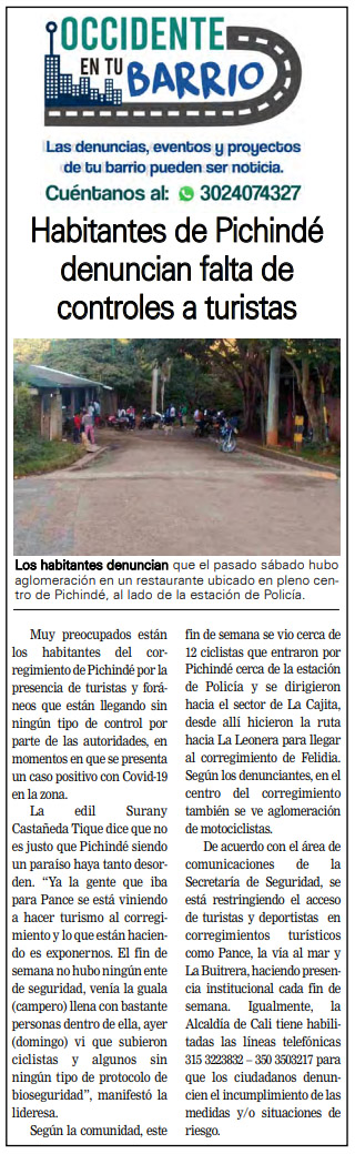 Habitantes de Pichindé denuncia falta de controles a turistas, Pag 9, Diario Occidente, 28072020+-.jpg