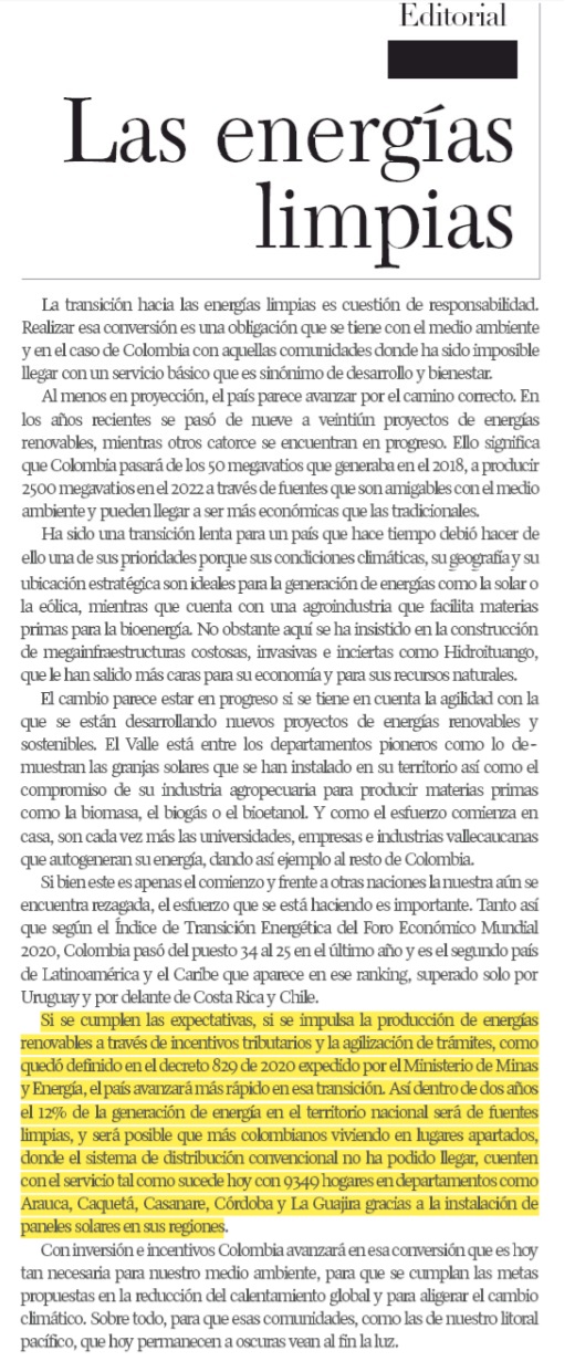La transición hacia las energías limpias es cuestión de responsabilidad. Realizar esa conversión es una obligación que se tiene con el medio ambiente y en el caso de Colombia con aquellas comunidades donde ha sido imposible llegar con un servicio básico que es sinónimo de desarrollo y bienestar.
