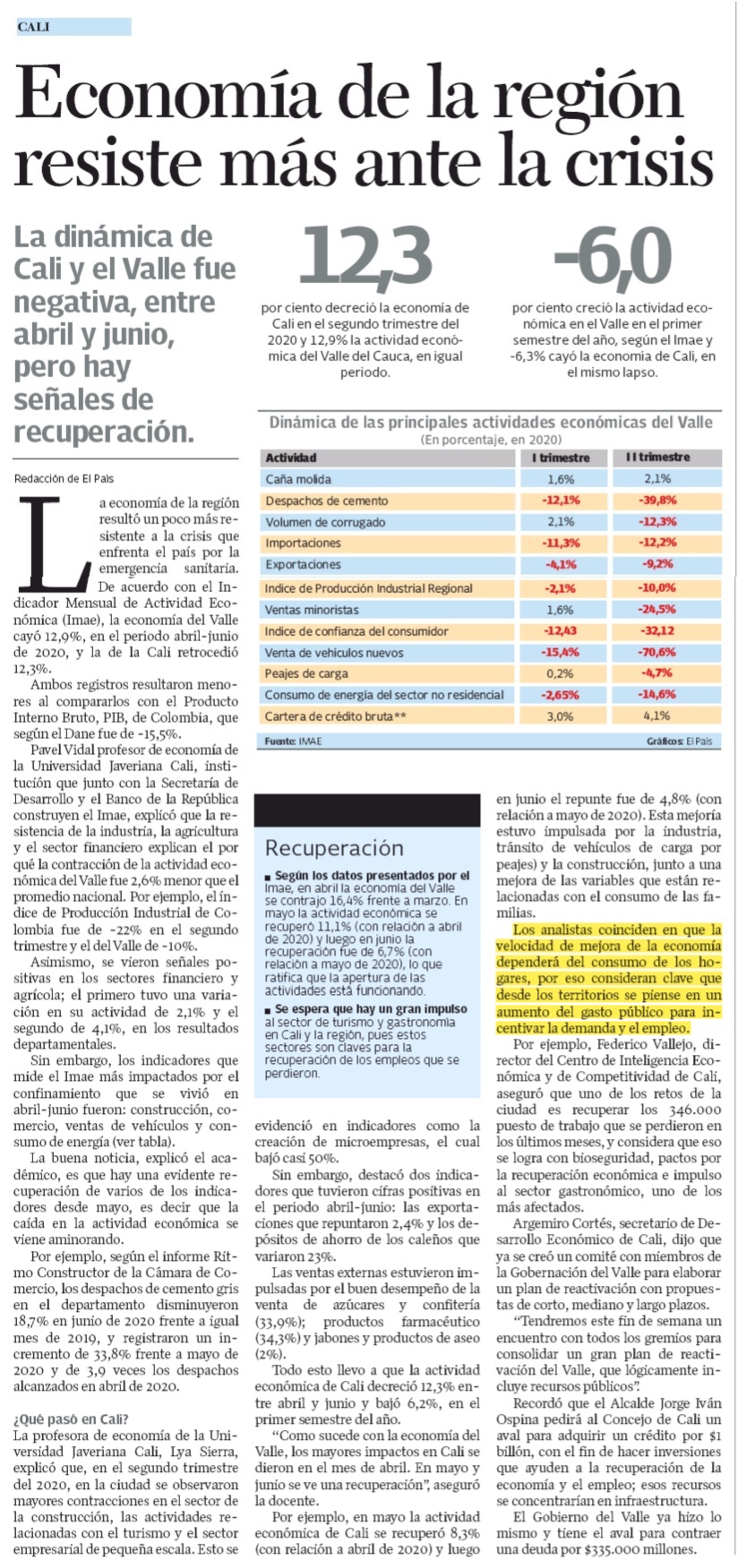 La economía de la región resultó un poco más resistente a la crisis que enfrenta el país por la emergencia sanitaria. De acuerdo con el Indicador Mensual de Actividad Económica (Imae), la economía del Valle cayó 12,9%, en el periodo abril-junio de 2020, y la de la Cali retrocedió 12,3%.