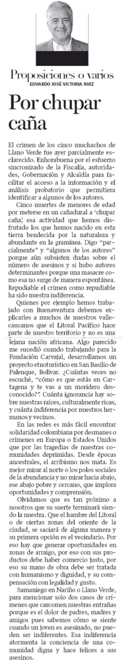 El crimen de los cinco muchachos de Llano Verde fue ayer parcialmente esclarecido. Enhorabuena por el esfuerzo sincronizado de la Fiscalía, autoridades, Gobernación y Alcaldía para facilitar el acceso a la información y el análisis probatorio que permitiera identificar a algunos de los autores.