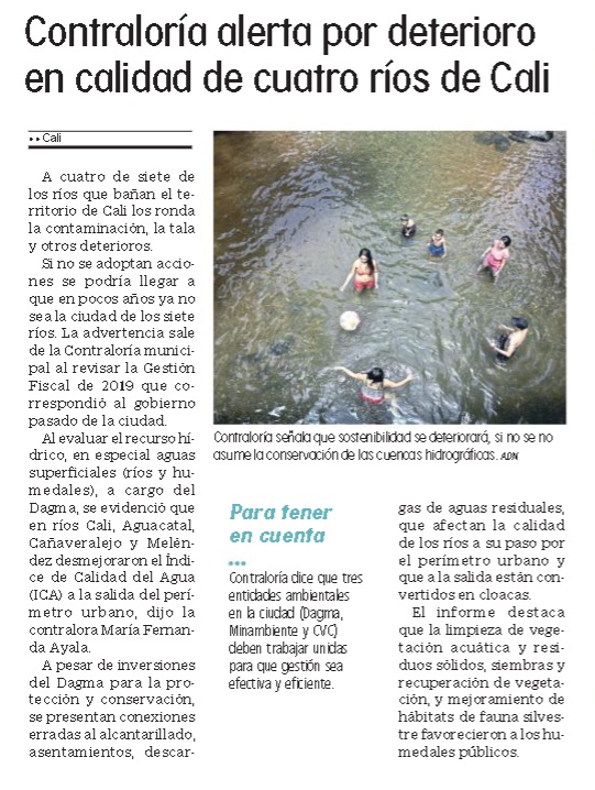 Contraloría dice que tres entidades ambientales en la ciudad (Dagma, Minambiente y CVC) deben trabajar unidas por los ríos de la ciudad