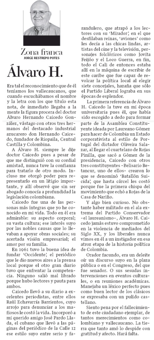 Era tal el reconocimiento que de él teníamos los vallecaucanos, que cuando escuchábamos el nombre y la letra con los que titulo esta nota, de inmediato llegaba a la mente la figura procera del doctor Álvaro Hernando Caicedo González, vástago con otros tres hermanos del destacado industrial azucarero don Hernando Caicedo, fundador de Riopaila, Central Castilla y Colombina.