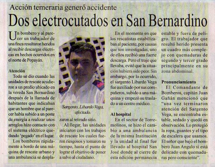 Un hombre que al parecer había subido a un poste de energía a realizar unos arreglos hizo contacto con el sistema eléctrico quedando 'pegado'en el lugar. En el momento en que los rescatistas estabilizaban al paciente, por causas que son investigadas, uno de ellos recibió una fuerte descarga. Pero el traje que llevaba, evitó que la situación hubiera sido peor. El hecho sucedió en un predio ubicado en la vereda San Bernardino.