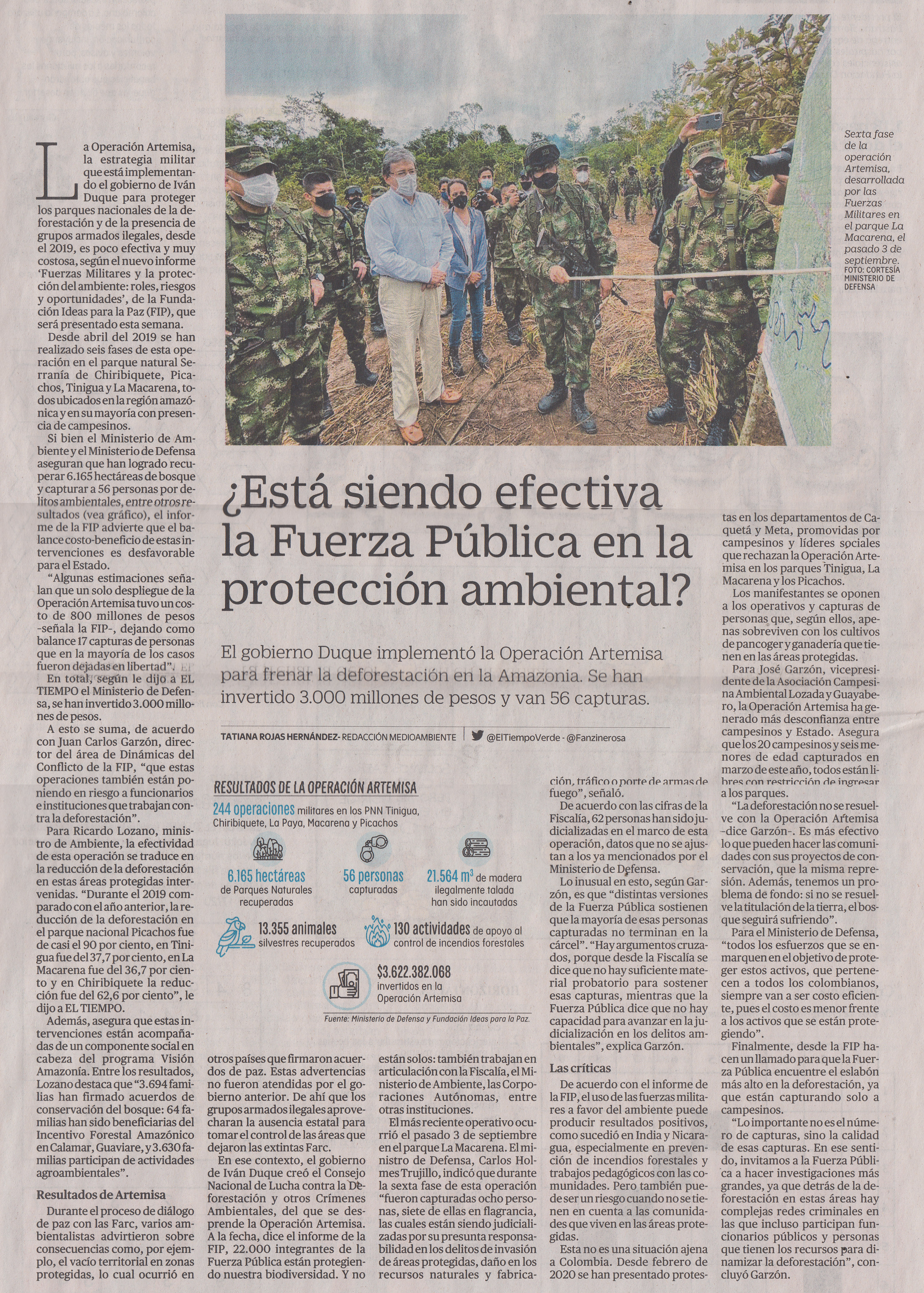La Operación Artemisa, la estrategia militar que está implementando el gobierno de Iván Duque para proteger los parques nacionales de la deforestación y de la presencia de grupos armados ilegales, desde el 2019, es poco efectiva y muy costosa, según el nuevo informe ‘Fuerzas Militares y la protección del ambiente: roles, riesgos y oportunidades’, de la Fundación Ideas para la Paz (FIP), que será presentado esta semana.