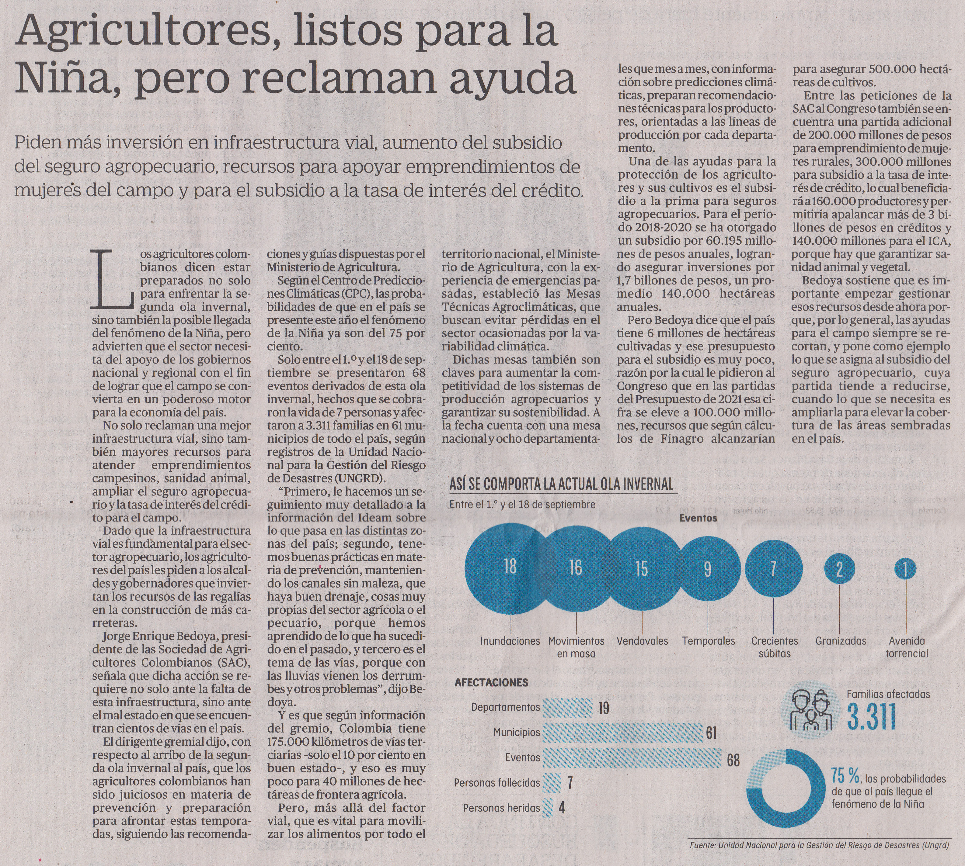 Agricultores listos para la Niña, pero reclaman ayuda, pag 1-8, ElTiempo