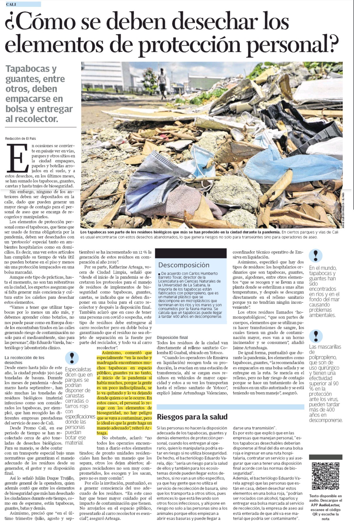 En ocasiones se convierte en paisaje ver en vías, parques y otros sitios en la ciudad empaques, papeles y botellas arrojados en el suelo, y a estos desechos, en los últimos meses, se han sumado los tapabocas, guantes, caretas y hasta trajes de bioseguridad.
