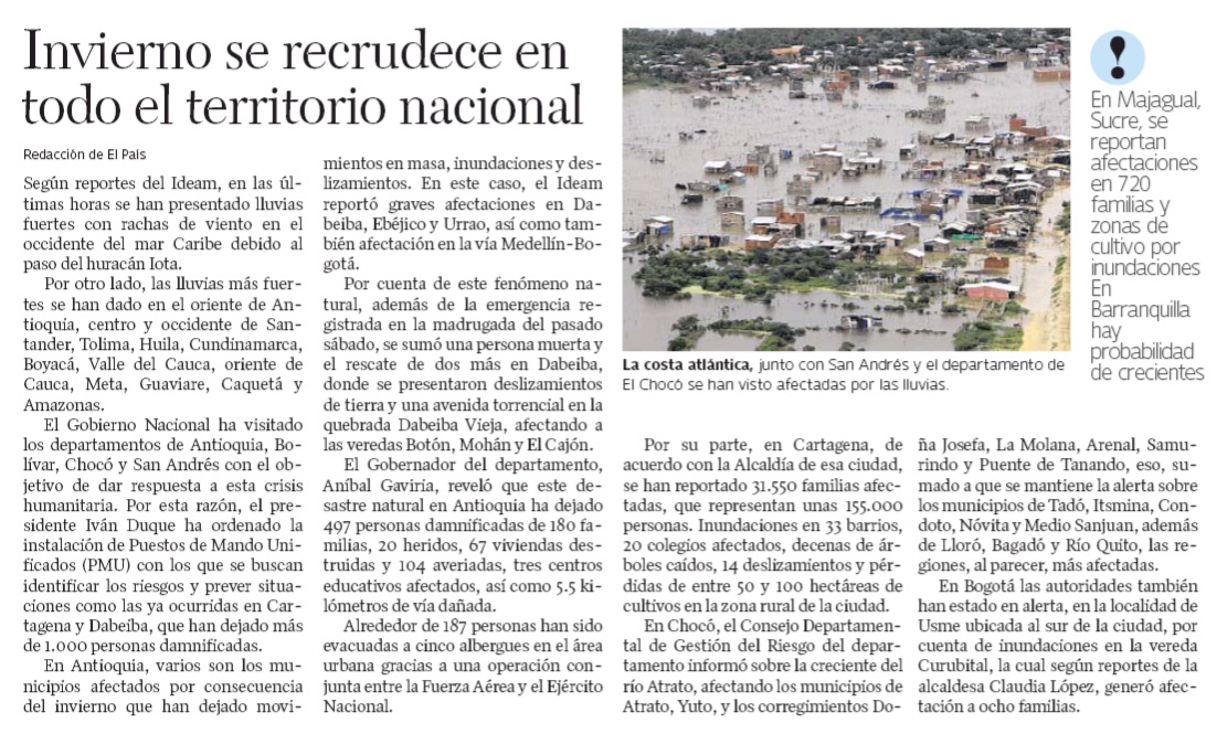 Los efectos del invierno se han recrudecido durante todo el puente festivo. Inundaciones, deslizamientos y caos a causa del fenómeno de La Niña, y el paso del huracán Iota que ya se encuentra en categoría cinco.
