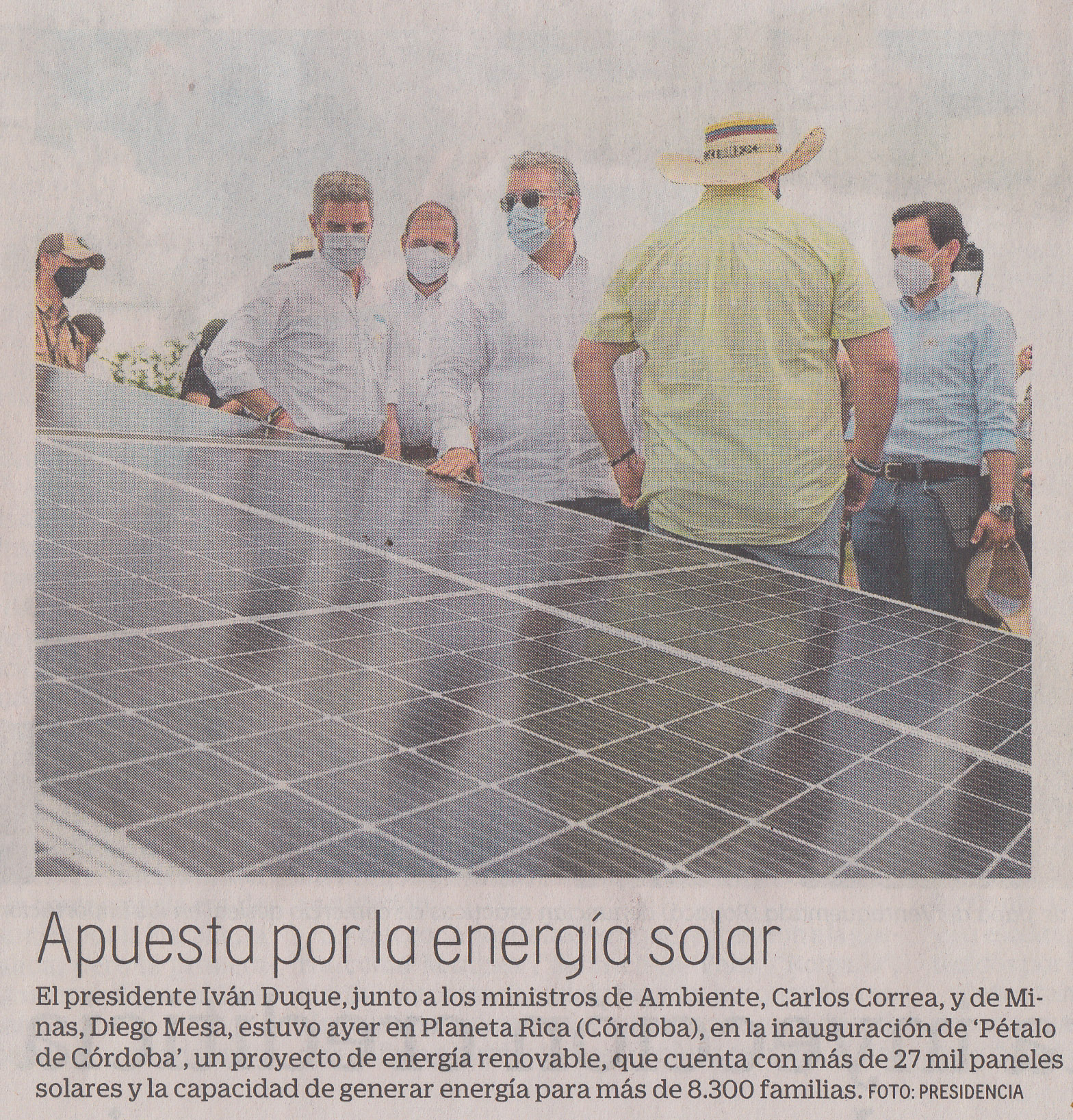 El presidente Iván Duque, junto a los ministros de Ambiente y de Minas, estuvo ayer en Planeta Rica, Córdoba, en la inauguración de 'Petalo de Córdoba', un proyecto de energía renovable, que cuenta con más de 27mil paneles solares y la capacidad de generar energía para más de 8300 familias.