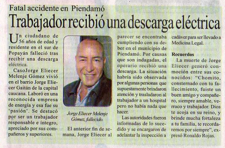 El anterior fin de semana, Jorge Eliecer Melenje al parecer se encontraba cumpliendo con su deber en el municipio de Piendamó. Por causas que son indagadas, el operario recibió una descarga eléctrica. La situación habría sido observada por algunas personas que brindaron atención y trasladaron al trabajador a un hospital pero no había nada que hacer.