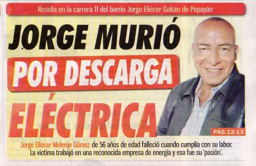 El anterior fin de semana, Jorge Eliecer melenje al parecer se encontraba cumpliendo con su deber en el municipio de Piendamó. Por causas que son indagadas, el operario recibió una descarga. La situación habría sido observada por algunas personas que supuestamente brindaron atención y trasladaron al trabajador a un hospital pero no había nada que hacer. (1ra parte)