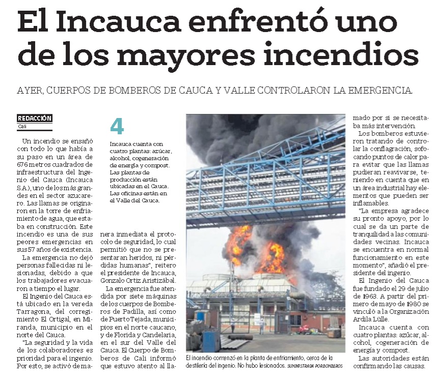 Un incendio se registró en el interior de la torre de enfriamiento de agua del ingenio azucarero Incauca. Por fortuna, la emergencia solo dejó daños materiales. El cuerpo de bomberos de Cali y voluntarios de otros municipios llegaron hasta la zona para controlar el fuego.
