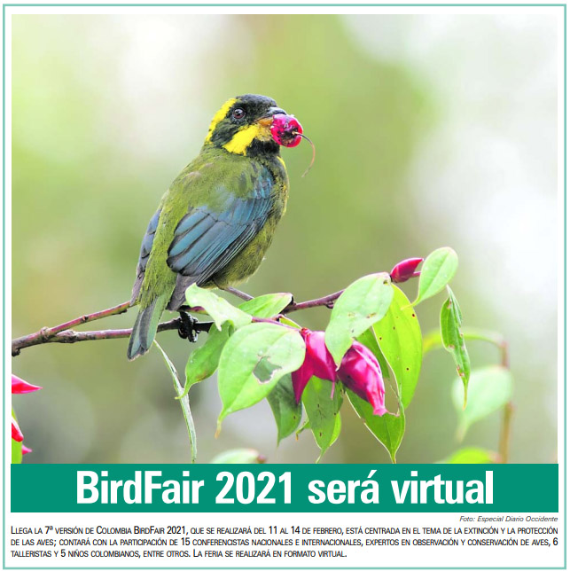 LLEGA LA 7ª VERSIÓN DE COLOMBIA BIRDFAIR 2021, QUE SE REALIZARÁ DEL 11 AL 14 DE FEBRERO, ESTÁ CENTRADA EN EL TEMA DE LA EXTINCIÓN Y LA PROTECCIÓN DE LAS AVES; CONTARÁ CON LA PARTICIPACIÓN DE 15 CONFERENCISTAS NACIONALES E INTERNACIONALES, EXPERTOS EN OBSERVACIÓN Y CONSERVACIÓN DE AVES, 6 TALLERISTAS Y 5 NIÑOS COLOMBIANOS, ENTRE OTROS. LA FERIA SE REALIZARÁ EN FORMATO VIRTUAL.