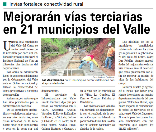 Mejorarán vías terciarias en 21 municipios del Valle, pag 5, Diario Occidente