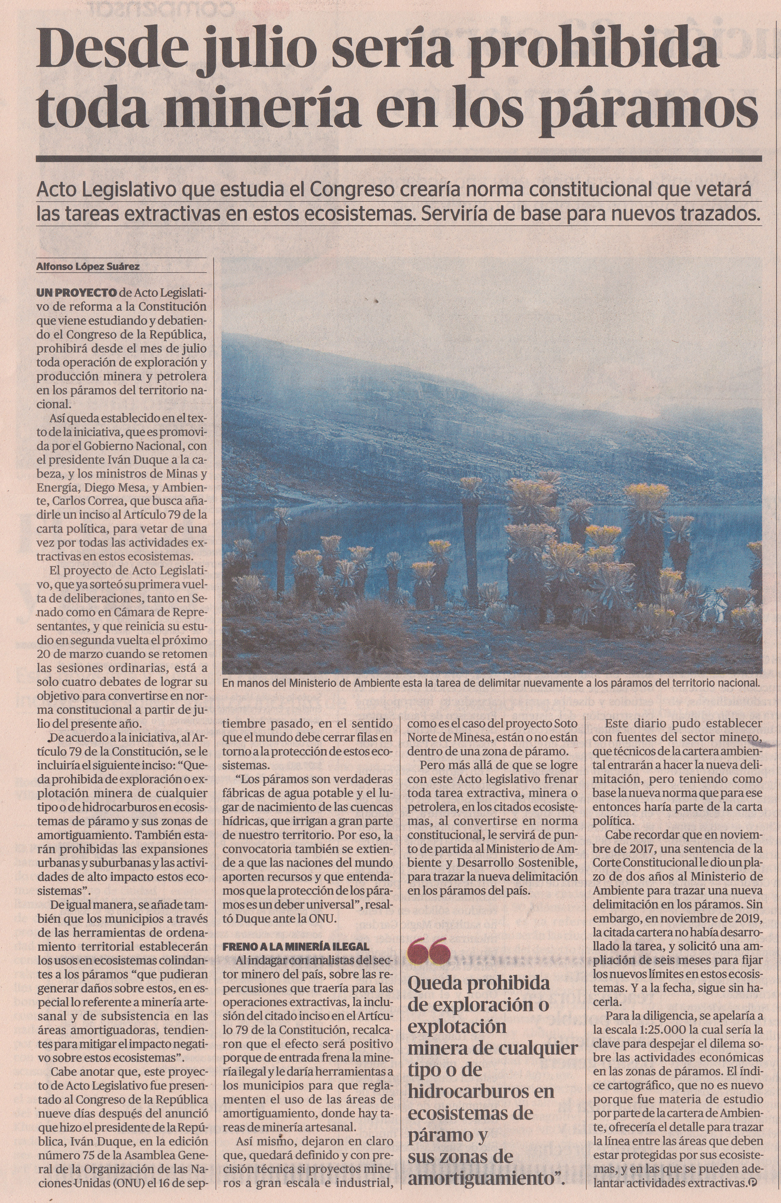 Desde julio sería prohibida toda minería en los páramos, pag 10, Portafolio