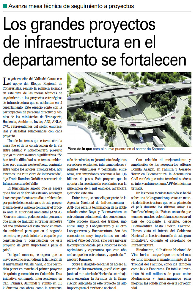 La gobernación del Valle del Cauca con el apoyo del Bloque Regional de Congresistas, realizó la primera jornada en este 2021 de las mesas técnicas de seguimiento a los proyectos estratégicos de infraestructura que se adelantan en el departamento. Este espacio contó con la participación de personal directivo y técnico de los ministerios de Transporte, Hacienda, Ambiente, Invías, ANI, ANLA, CVC, representantes del sector empresarial y alcaldías relacionadas con cada proyecto.