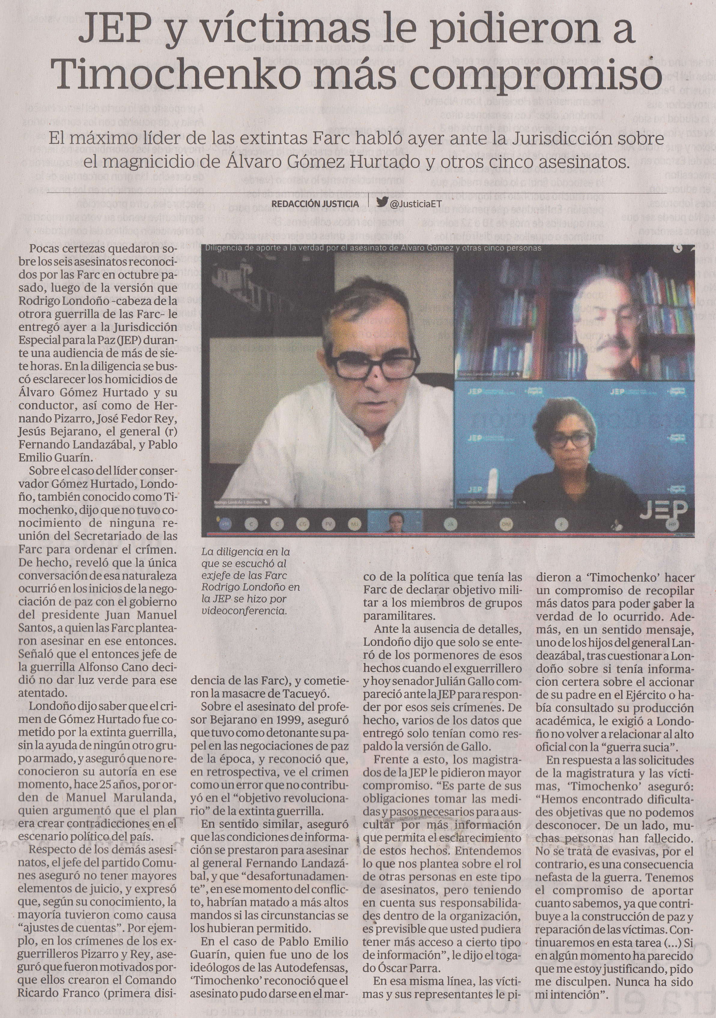 JEP y víctimas le pidieron a Timonchenko más compromiso, pag 1-5, ElTiempo