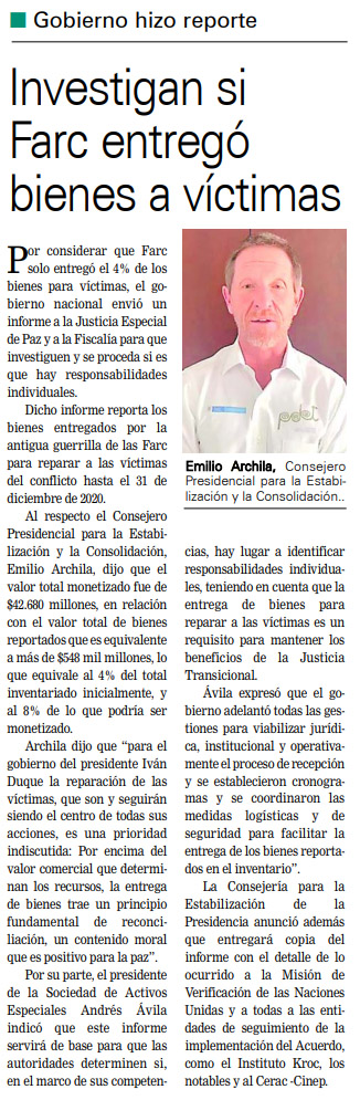 Por considerar que Farc solo entregó el 4% de los bienes para víctimas, el gobierno nacional envió un informe a la Justicia Especial de Paz y a la Fiscalía para que investiguen y se proceda si es que hay responsabilidades individuales. Dicho informe reporta los bienes entregados por la antigua guerrilla de las Farc para reparar a las víctimas del conflicto hasta el 31 de diciembre de 2020.