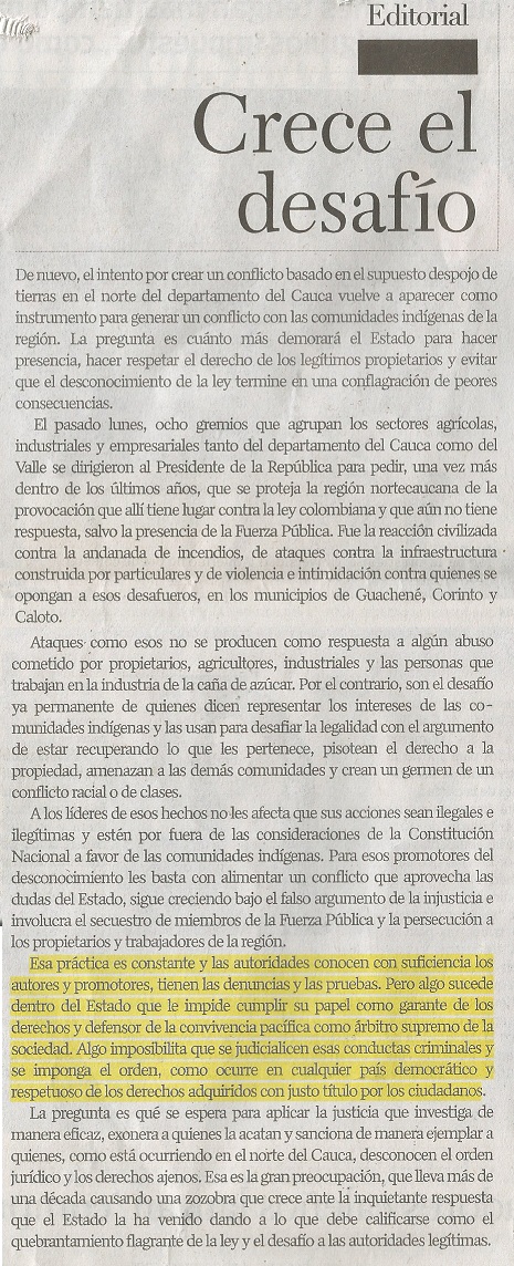 De nuevo, el intento por crear un conflicto basado en el supuesto despojo de tierras en el norte del departamento del Cauca vuelve a aparecer como instrumento para generar un conflicto con las comunidades indígenas de la región. La pregunta es cuánto más demorará el Estado para hacer presencia, hacer respetar el derecho de los legítimos propietarios y evitar que el desconocimiento de la ley termine en una conflagración de peores consecuencias.