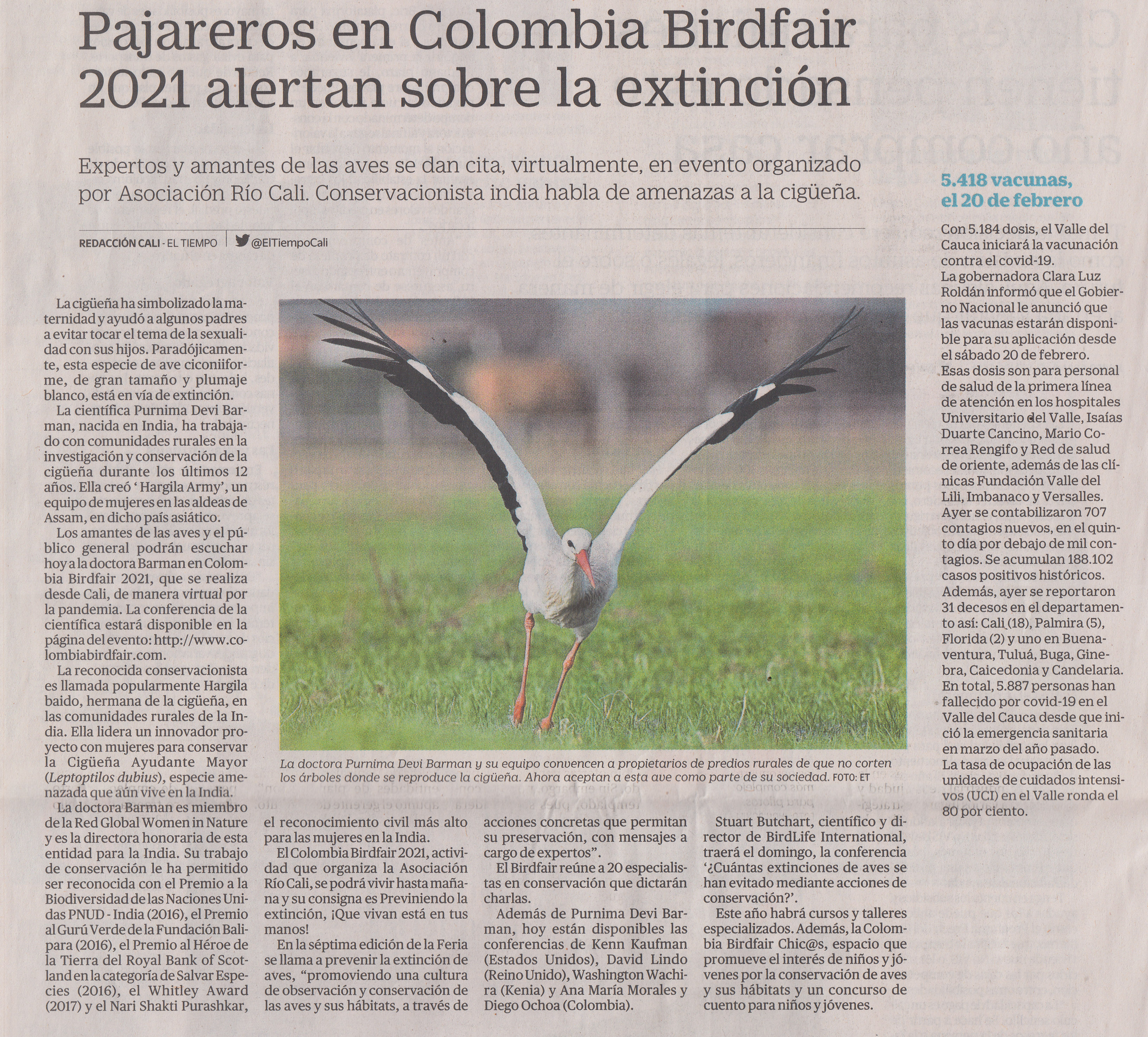 Expertos y amantes de las aves se dan cita, virtualmente, en evento organizado por Asociación Río Cali. Conservacionista india habla de amenazas a la cigueña.