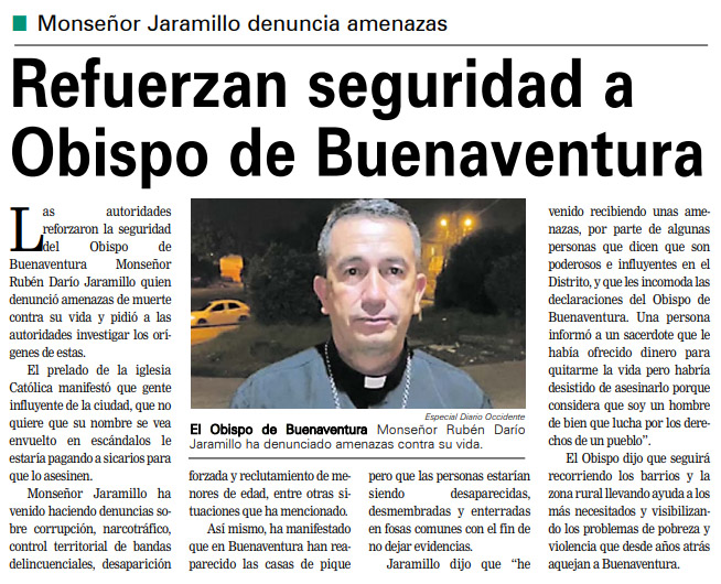 Las autoridades reforzaron la seguridad del Obispo de Buenaventura Monseñor Rubén Darío Jaramillo quien denunció amenazas de muerte contra su vida y pidió a las autoridades investigar los orígenes de estas.