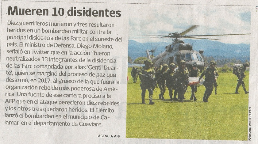 Diez guerrilleros murieron y tres resultaron heridos en un bombardeo militar contra la principal disidencia de las FARC en el sureste de Colombia, informaron fuentes oficiales este martes.