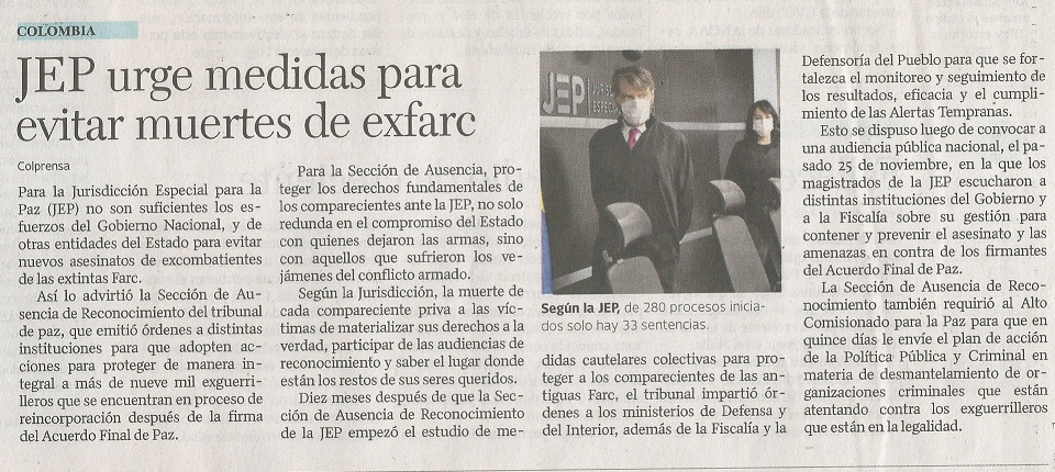 Para la Jurisdicción Especial para la Paz, JEP, no son suficientes los esfuerzos del Gobierno Nacional y de otras entidades del Estado para evitar nuevos asesinatos de excombatientes de las Farc.