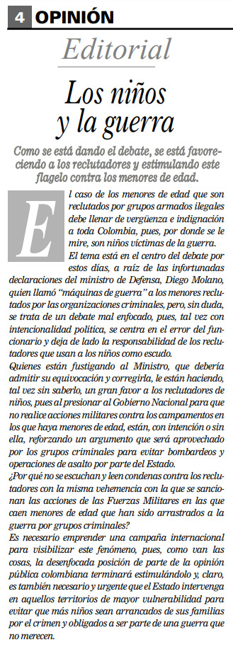 El tema está en el centro del debate por estos días, a raíz de las infortunadas declaraciones del ministro de Defensa, Diego Molano, quien llamó “máquinas de guerra” a los menores reclutados por las organizaciones criminales, pero, sin duda, se trata de un debate mal enfocado, pues, tal vez con intencionalidad política, se centra en el error del funcionario y deja de lado la responsabilidad de los reclutadores que usan a los niños como escudo.