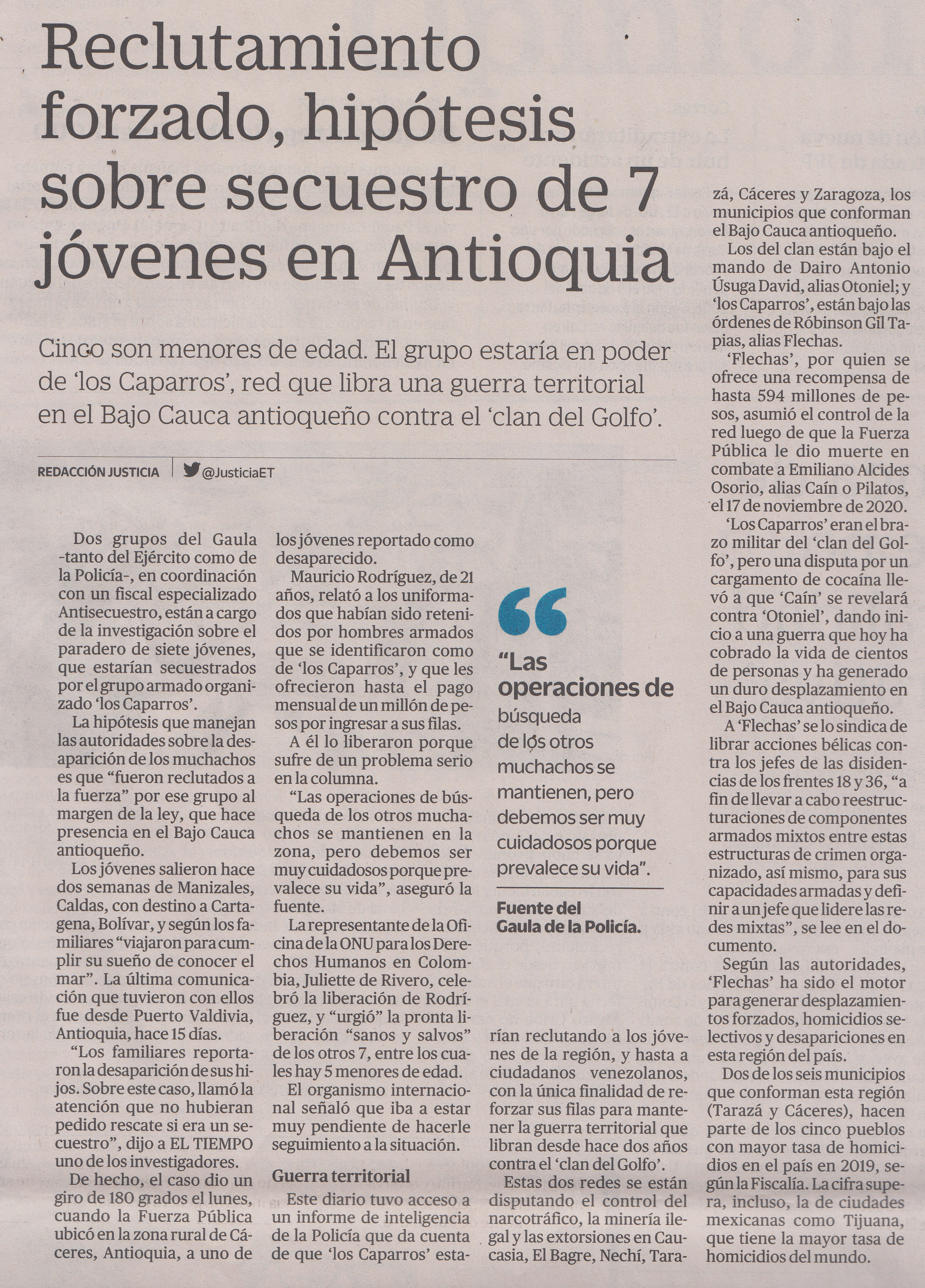Reclutamiento forzado, hipótesis sobre secuestro de 7 jóvenes, pag 1-4, ElTiempo