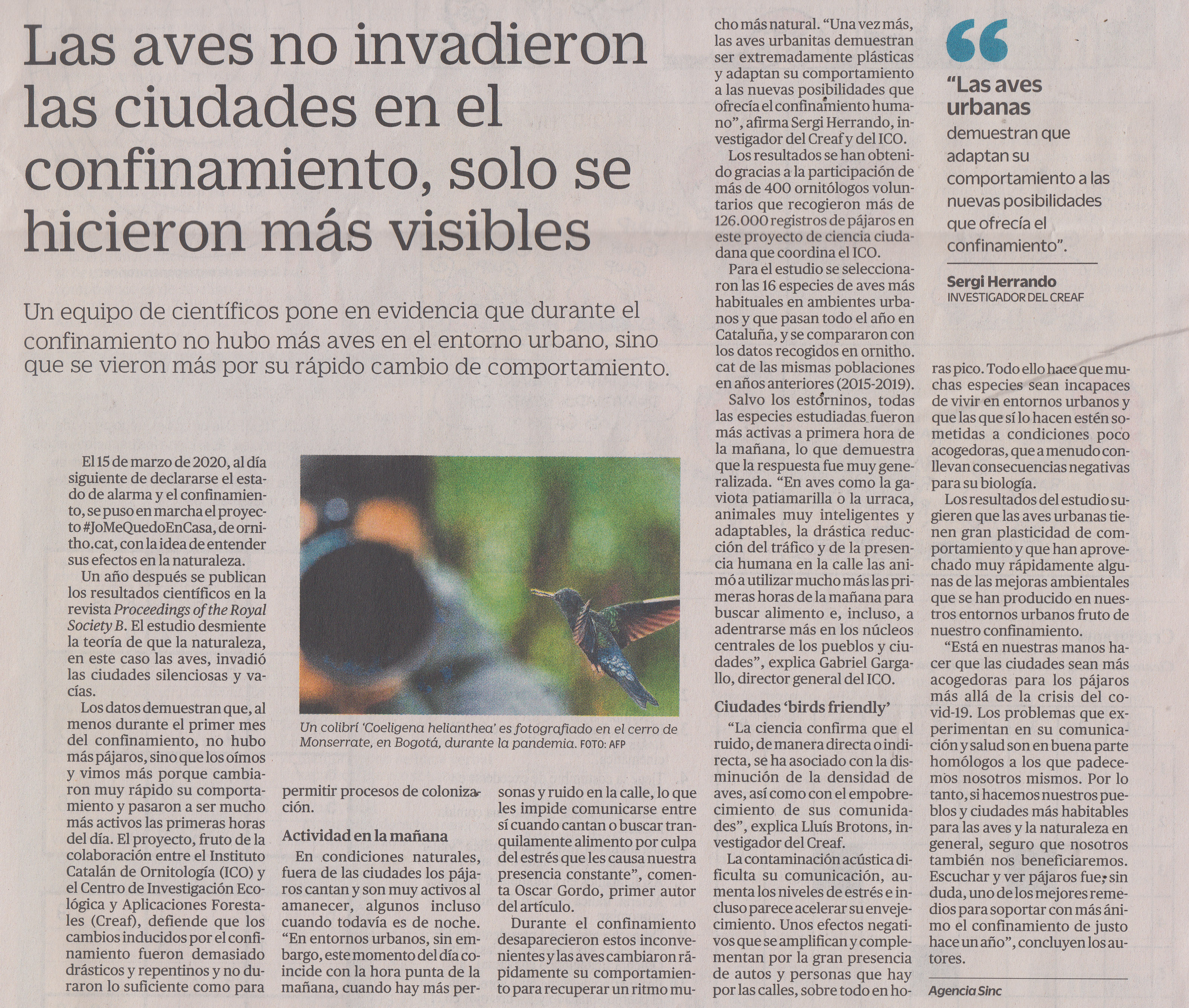 Las aves no invadieron las ciudades en el confinamiento, solo se hicieron más visibles, pag 2-14,ElTiempo