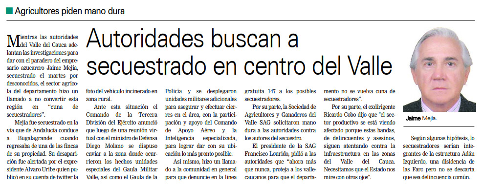 Mientras las autoridades del Valle del Cauca adelantan las investigaciones para dar con el paradero del empresario azucarero Jaime Mejía, secuestrado el martes por desconocidos, el sector agrícola del departamento hizo un llamado a no convertir esta región en “cuna de secuestradores”. Mejía fue secuestrado en la vía que de Andalucía conduce a Bugalagrande cuando regresaba de una de las fincas de su propiedad. Su desaparición fue alertada por el expresidente Alvaro Uribe quien publicó en su cuenta de twitter la foto del vehículo incinerado en zona rural