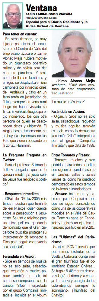 - En otros tiempos, no muy lejanos por cierto, el secuestro en el Centro del Valle del empresario azucarero Jaime Alonso Mejía hubiera motivado un gigantesco operativo militar y de policía para dar con su paradero. Yimmi, como lo llaman familiares y amigos, se desplazaba en una camioneta por inmediaciones de Andalucía y cayó en un falso retén en jurisdicción de Tuluá, siempre en zona rural luego de haber visitado su finca. El vehículo luego apareció incinerado. Iba con otra persona de quien se desconocen datos y ubicación. El plagio, hasta el momento, se atribuye a disidencias de las Farc que vienen operando en la zona....Hummm.