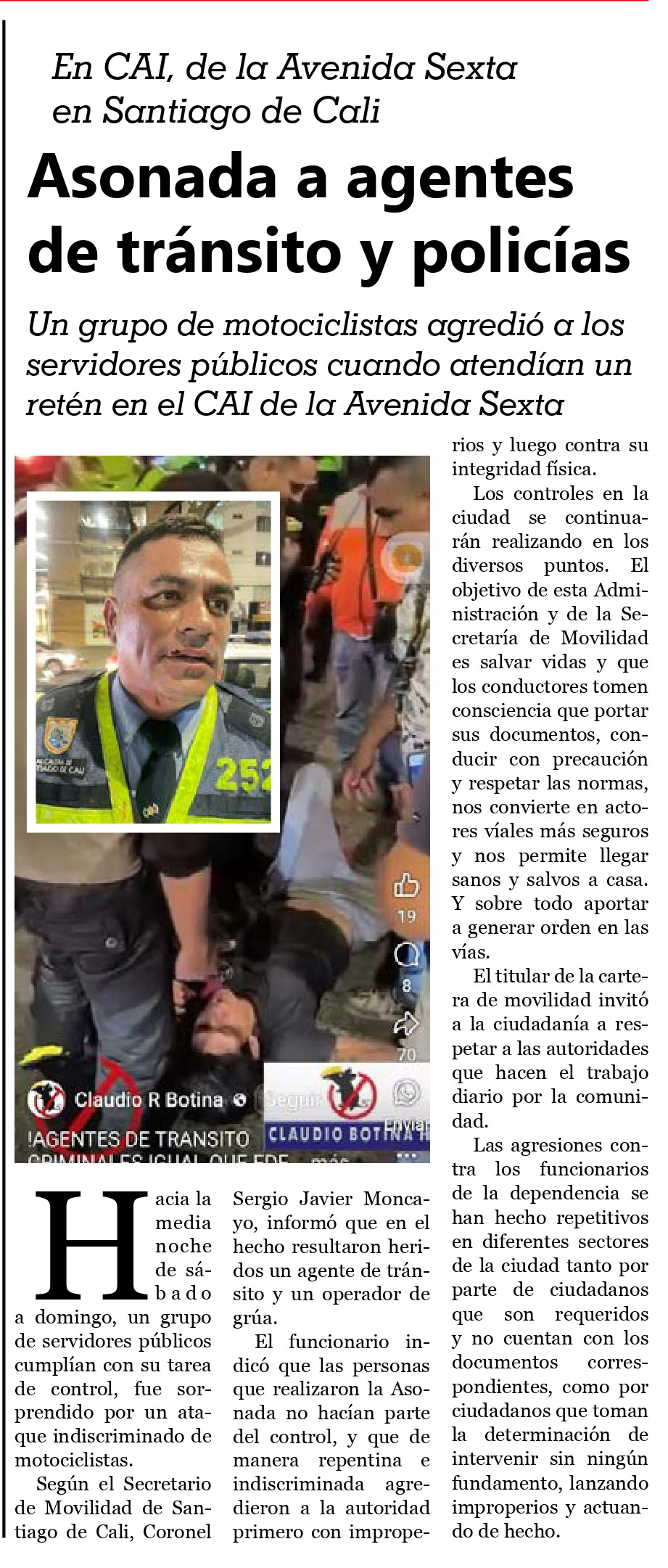Hacia la media noche de sáb a d o a domingo, un grupo de servidores públicos cumplían con su tarea de control, fue sorprendido por un ataque indiscriminado de motociclistas. Según el Secretario de Movilidad de Santiago de Cali, Coronel Sergio Javier Moncayo, informó que en el hecho resultaron heridos un agente de tránsito y un operador de