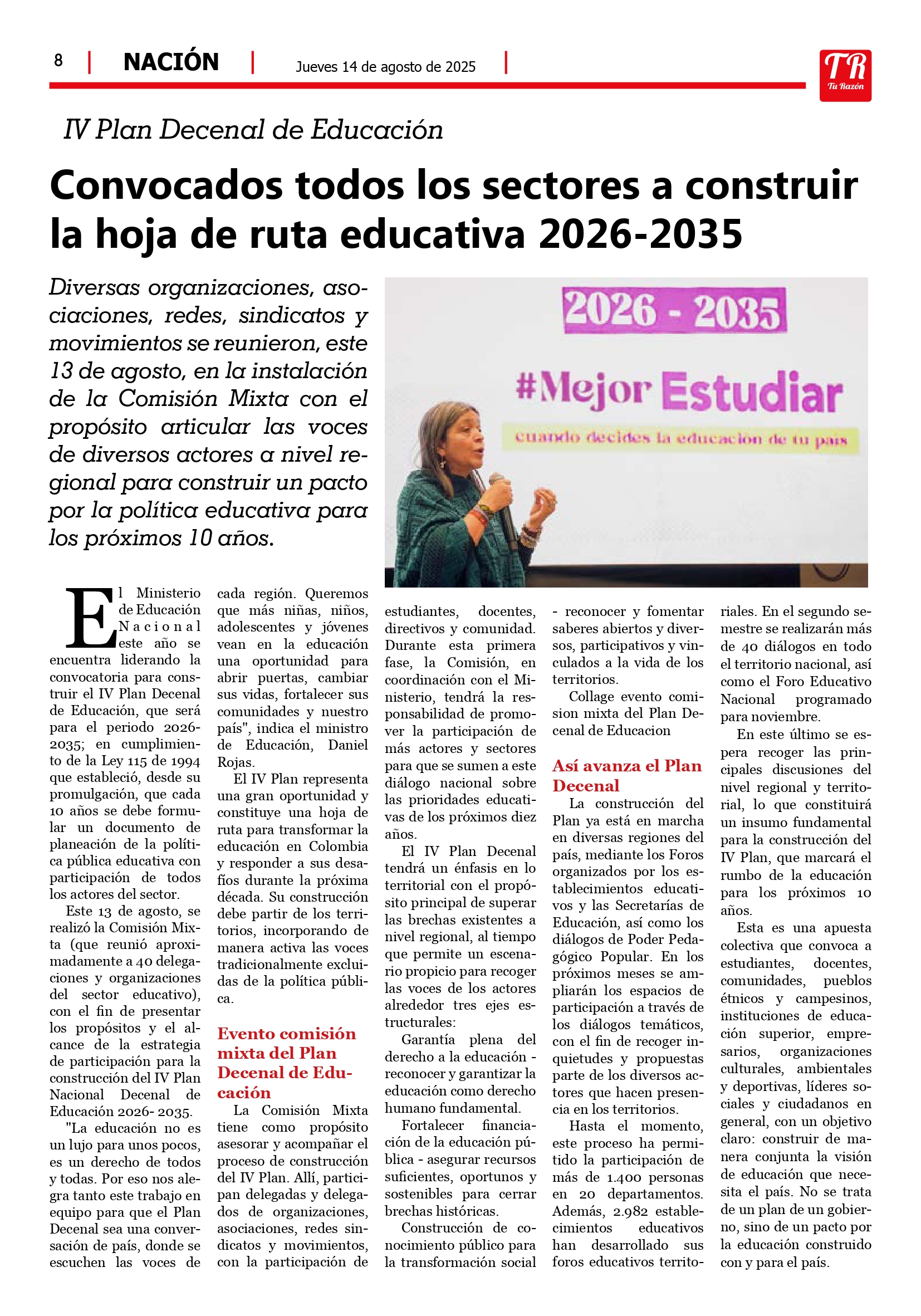 El Ministerio de Educación N a c i o n a l este año se encuentra liderando la convocatoria para construir el IV Plan Decenal de Educación, que será para el periodo 2026- 2035; en cumplimiento de la Ley 115 de 1994 que estableció, desde su promulgación, que cada 10 años se debe formular un documento de planeación de la política pública educativa con participación de todos los actores del sector.