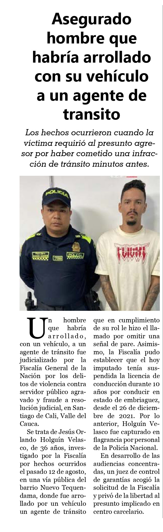 Un hombre que habría a r r o l l a d o , con un vehículo, a un agente de tránsito fue judicializado por la Fiscalía General de la Nación por los delitos de violencia contra servidor público agravado y fraude a resolución judicial, en Santiago de Cali, Valle del Cauca.