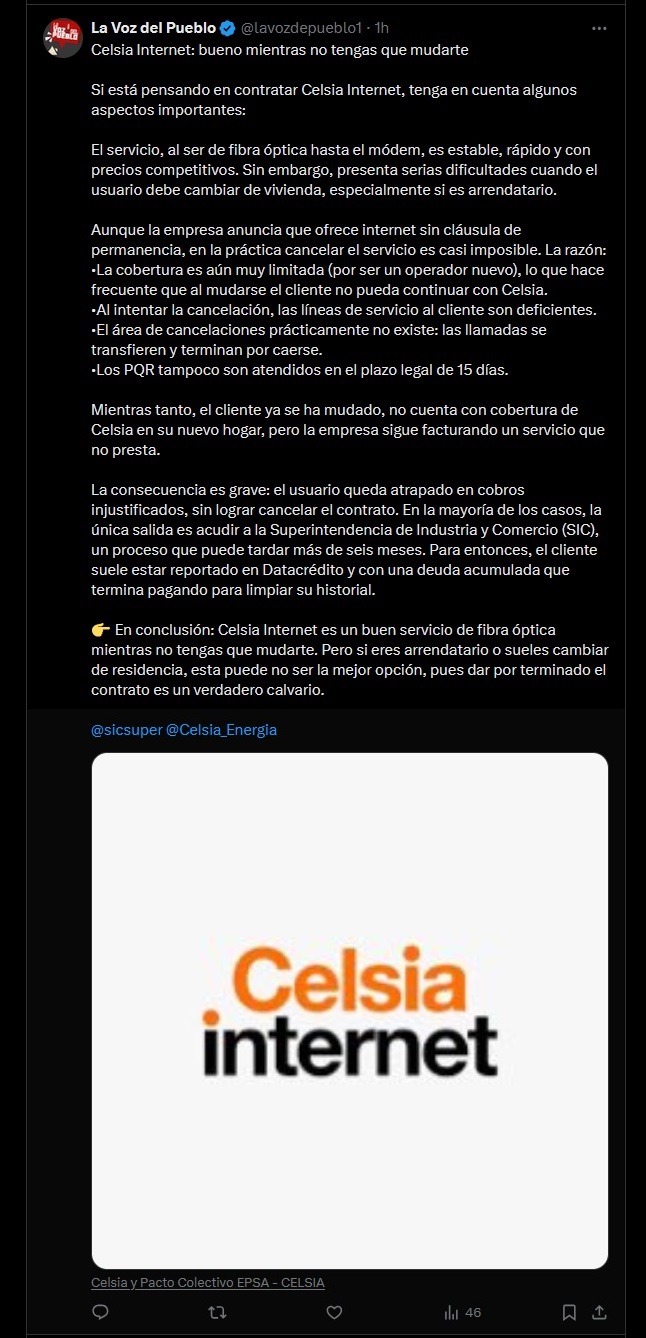 Destacan velocidad internet de Celsia pero critican problemas al cambiarse de domicilio, La Voz del Pueblo.X