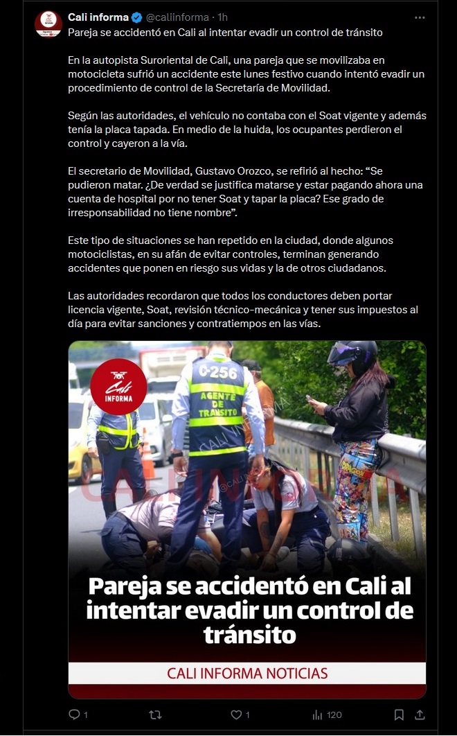 El secretario de Movilidad, Gustavo Orozco, se refirió al hecho: “Se pudieron matar. ¿De verdad se justifica matarse y estar pagando ahora una cuenta de hospital por no tener Soat y tapar la placa? Ese grado de irresponsabilidad no tiene nombre”.