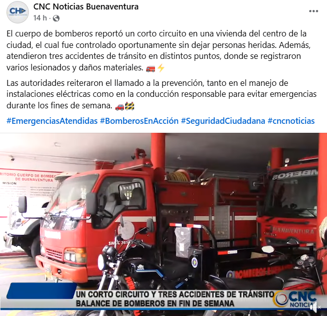 Un corto circuito y tres accidentes de transito, balance fin de semana de los bomberos, CNC Noticias Buenaventura, Facebook