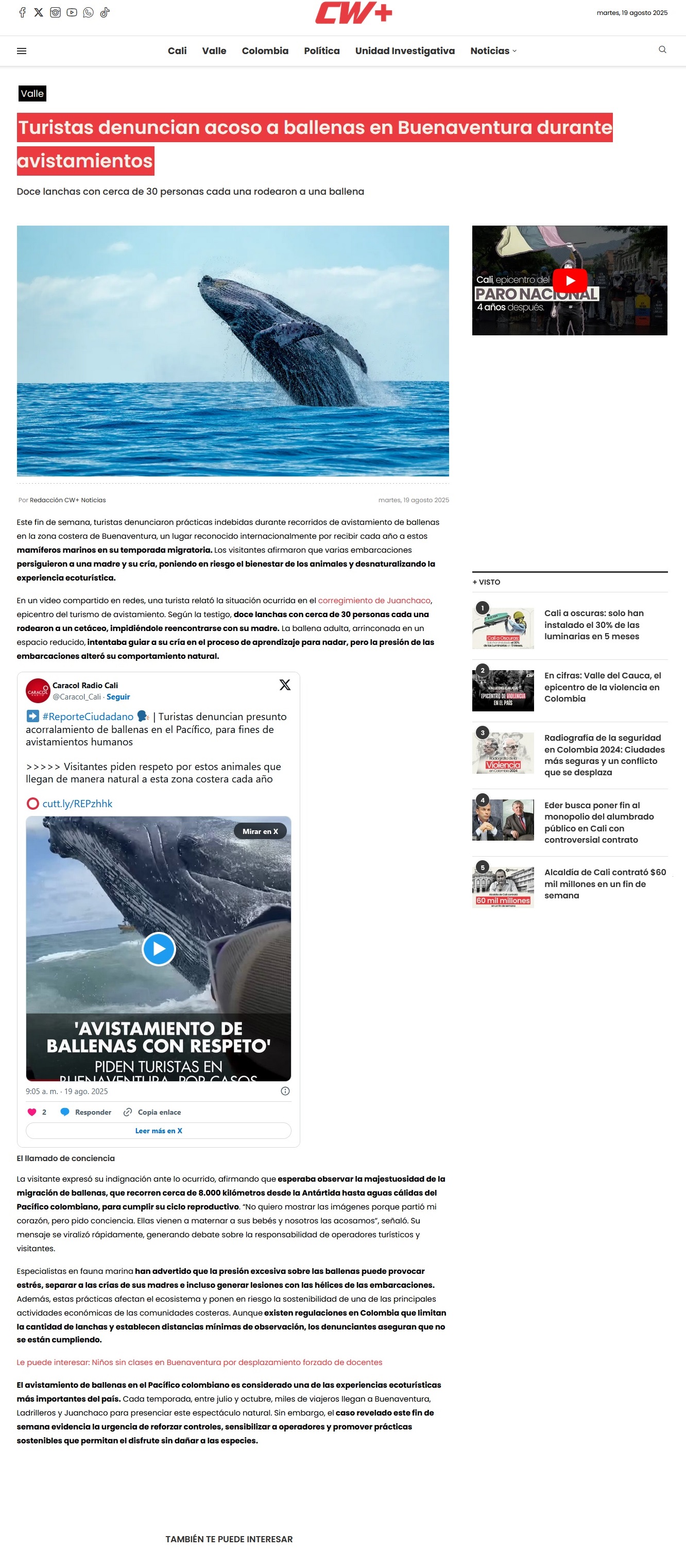 Este fin de semana, turistas denunciaron prácticas indebidas durante recorridos de avistamiento de ballenas en el corregimiento de JUanchaco, un lugar reconocido internacionalmente por recibir cada año a estos mamíferos marinos en su temporada migratoria. Los visitantes afirmaron que varias embarcaciones persiguieron a una madre y su cría, poniendo en riesgo el bienestar de los animales y desnaturalizando la experiencia ecoturística.