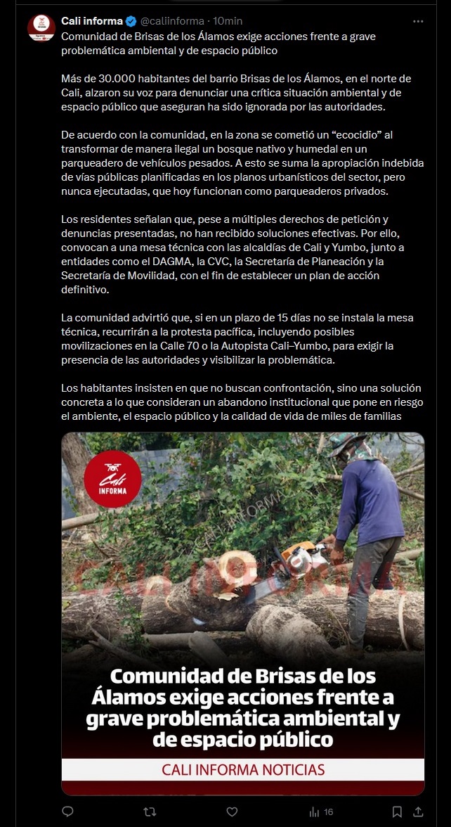 Comunidad de Brisas de los Álamos exige acciones frente a ecocidio de bosque nativo, Cali Informa.X,