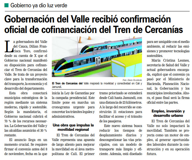 Gobernación recibió confirmación de confinanciación Tren de Cercanías, pág5, Diario Occidente