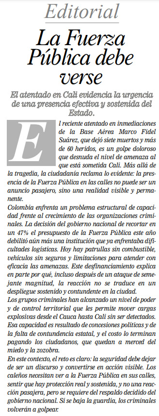 El reciente atentado en inmediaciones de la Base Aérea Marco Fidel Suárez, que dejó siete muertos y más de 60 heridos, es un golpe doloroso que desnuda el nivel de amenaza al que está sometida Cali.