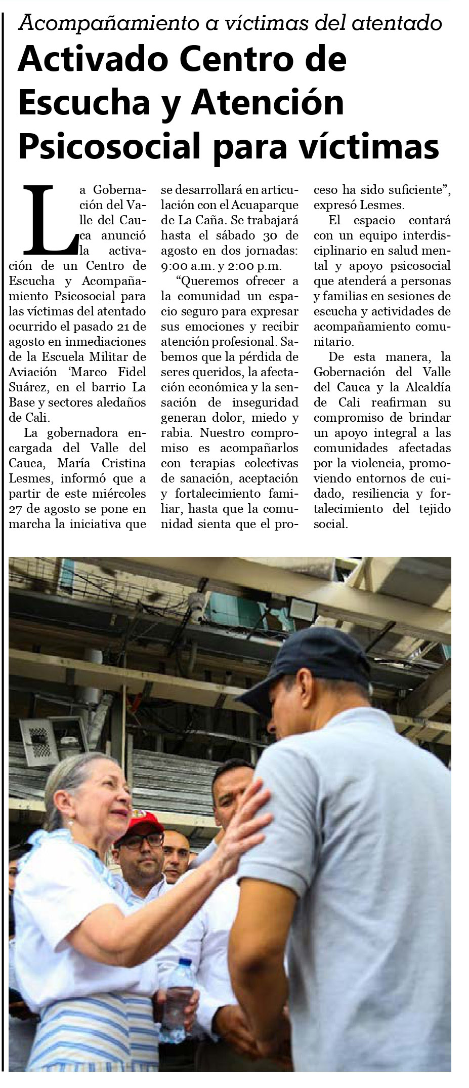 La Gobernación del Valle del Cauca anunció la activación de un Centro de Escucha y Acompañamiento Psicosocial para las víctimas del atentado ocurrido el pasado 21 de agosto en inmediaciones de la Escuela Militar de