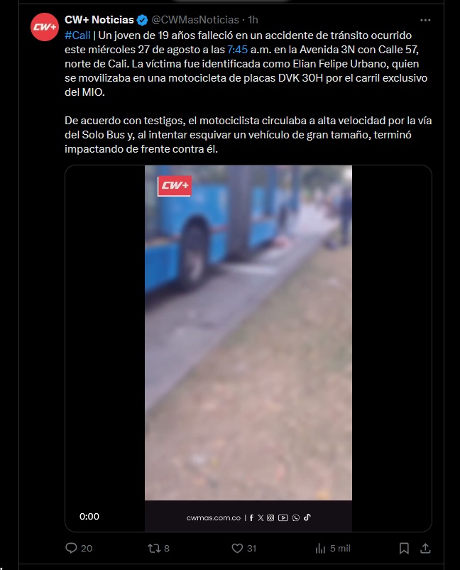Un joven de 19 años falleció en un accidente de tránsito ocurrido este miércoles 27 de agosto a las 7:45a.m. en la Avenida 3N con Calle 57, norte de Cali. La víctima fue identificada como Elian Felipe Urbano, quien se movilizaba en una motocicleta de placas DVK 30H por el carril exclusivo del MIO.
